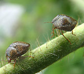 体長5mm。空き地や河川敷に繁茂しているクズなどのマメ科の植物によく見られる丸い、小さなカメムシ。干している洗濯物や布団に付着して悪臭を放ちます。2003年7月16日
