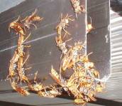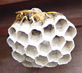 スズメバチのような攻撃性はないが刺されると痛い。写真は巣づくりをする女王蜂。育房(小部屋)は20個で1ヶ月程度の初期の巣。