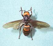 体長27〜40mm。オオスズメバチは最も大型のハチで屋根裏、軒先、生垣などに縞模様の大きなボール状の巣を作る。攻撃性が強いので近づかないように注意。
