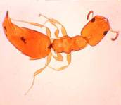 体長2〜2.5mm。アリのような形をしているのでアリガタバチと呼ばれ、シバンムシの幼虫に寄生するハチ。発生源は畳、ジュータン、乾燥食品、ペットフードなど。