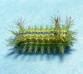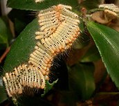 ツバキ、サザンカの葉に集団で発生する毛虫。年に2回、5〜6月と8〜9月頃に幼虫が見られる。毒針に触れた直後はあまり痛みはないが、後でヒリヒリした痛みや強いかゆみ1週間以上続くことがある。