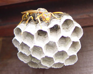 スズメバチのような攻撃性はないが刺されると痛い。写真は巣づくりをする女王蜂。育房(小部屋)は20個で1ヶ月程度の初期の巣。