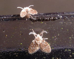 成虫は体長4〜5mm。 トイレや風呂の壁に羽をひろげて止まっているのがよくみられる。卵から成虫になるまで約15日。写真は高槻市内の民家の浄化槽内で2月11日に撮影したもの。