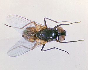 体長6〜8 mm。 ゴミの埋立地等で大発生し、近隣の住宅に入りこみ食べ物にたかる。夜間は天井面に静止する習性がある。
